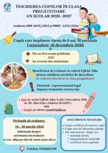 - Evaluarea dezvoltării copiilor care împlinesc vârsta de 6 ani în perioada 1 septembrie – 31 decembrie 2026 se realizează de către Centrul Județean de Resurse și Asistență Educațională Alba doar în situația copiilor care nu au fost școlarizați SAU au revenit din străinătate.